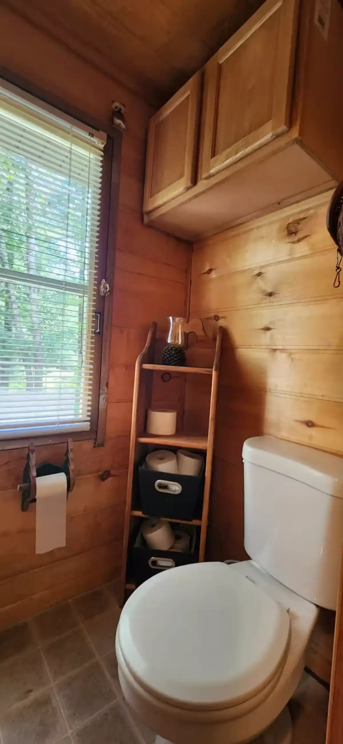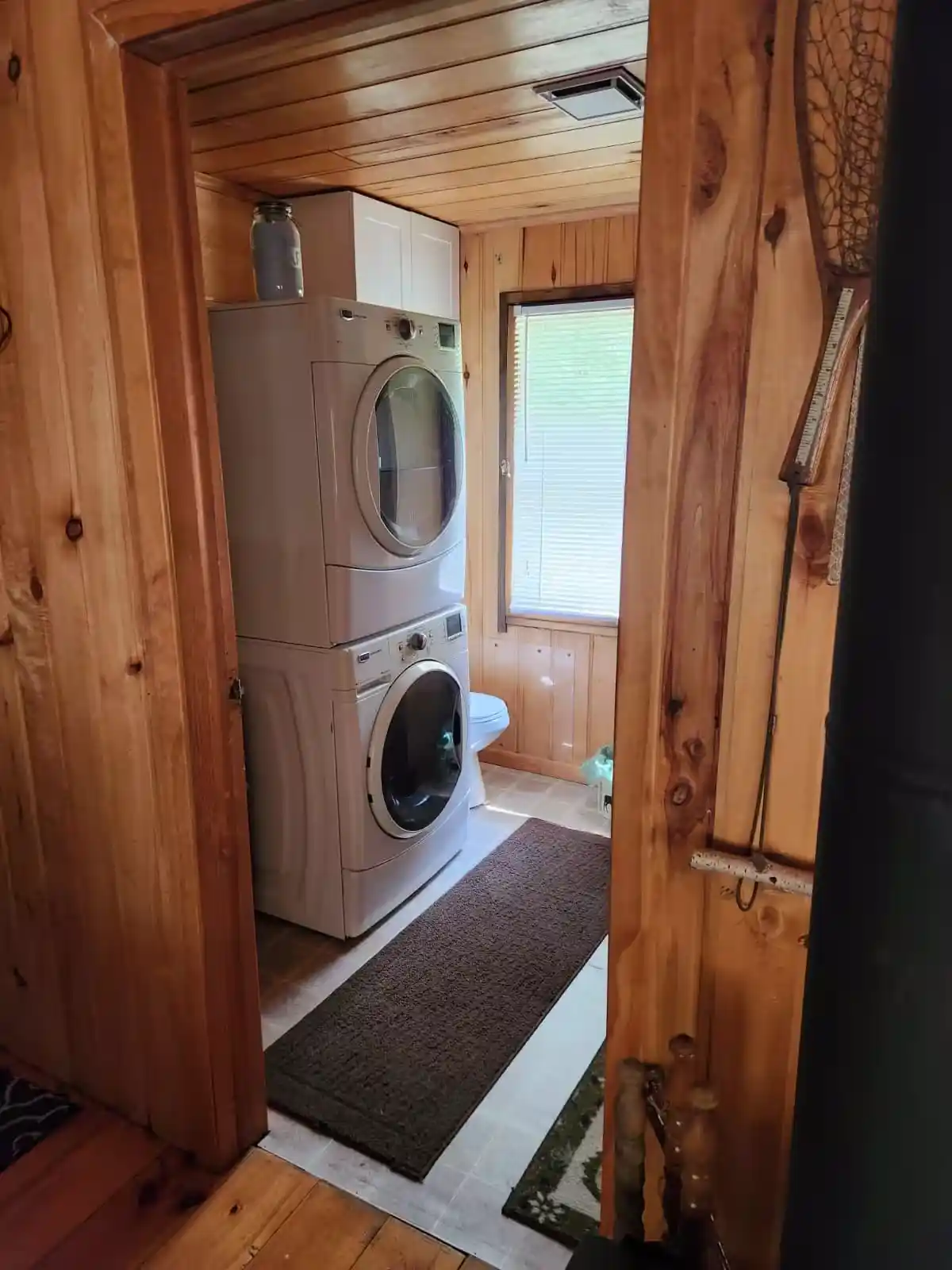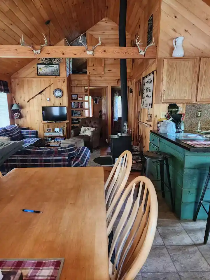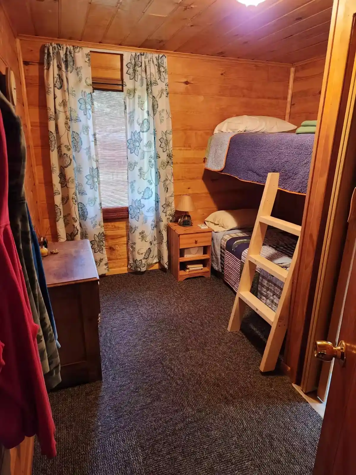 The cabin features 2 bedrooms, and 1.5 bathrooms to comfortably sleep 6. 1 queen bed, 1 twin bunk bed, and 1 queen couch bed.